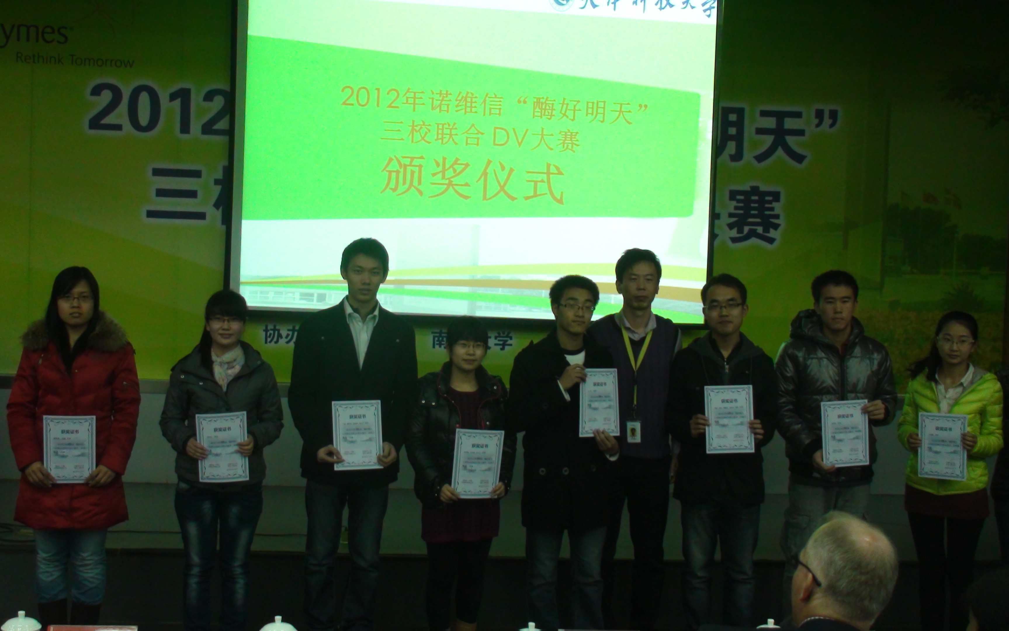 11月21日下午,2012年度诺维信“酶好明天”三校联合创新大赛总决赛在天津科技大学举行。此次比赛由诺维信(中国)技术有限公司、taptap体育官网入口、天津大学与天津科技大学共同举办。本次活动以“绿色发展与创新――如何用现代生物技术改造传统产业实现可持续性发展”为主题,分为创新科技设计大赛和“酶好明天”创新DV秀大赛。
