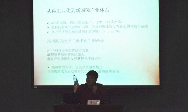 段文斌教授通过对欧美经济的虚拟化与国际产业转移、新国际产业体系、美国经济发展的两个根本性变化、美国经济转型的统一过程、货币战以及大国博弈、从国际工业化到新国际产业体系以及从双本位体系到世界货币体系的转变过程的分析,指出中国经济发展双重任务是金融深化、产业升级和促进人民币的国际化。