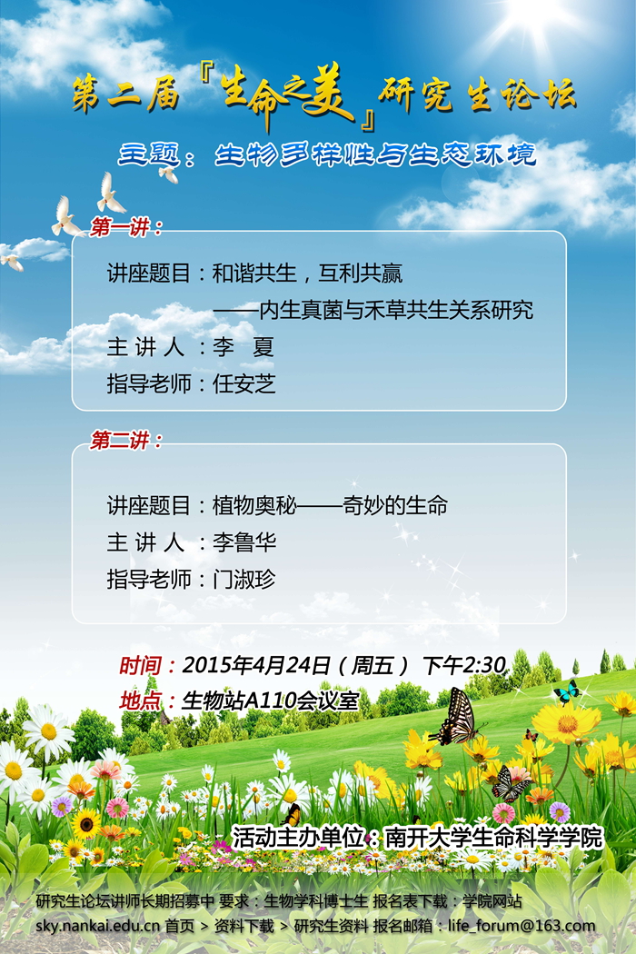 第二届“生命之美”研究生论坛第二次学术会议将于4月24日,周五,下午2:30在生物站A110会议室举办。主要内容为:
