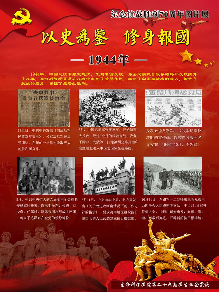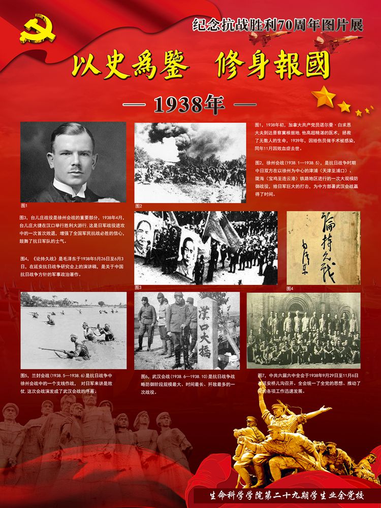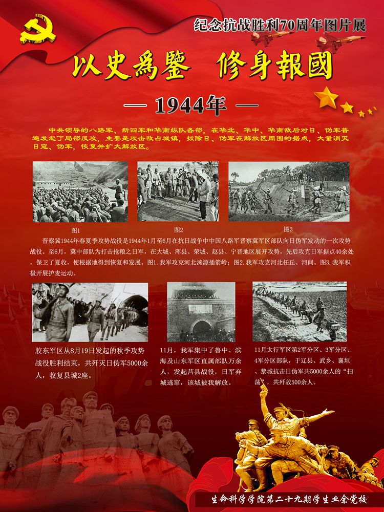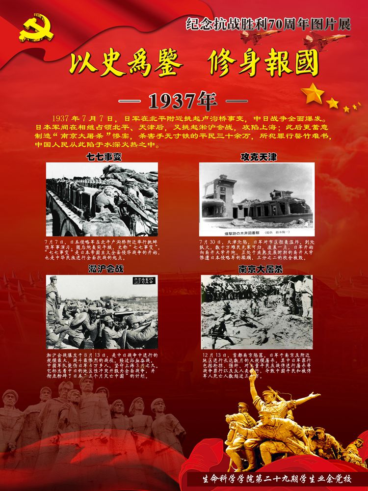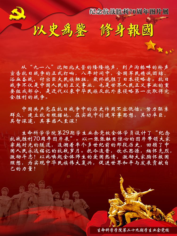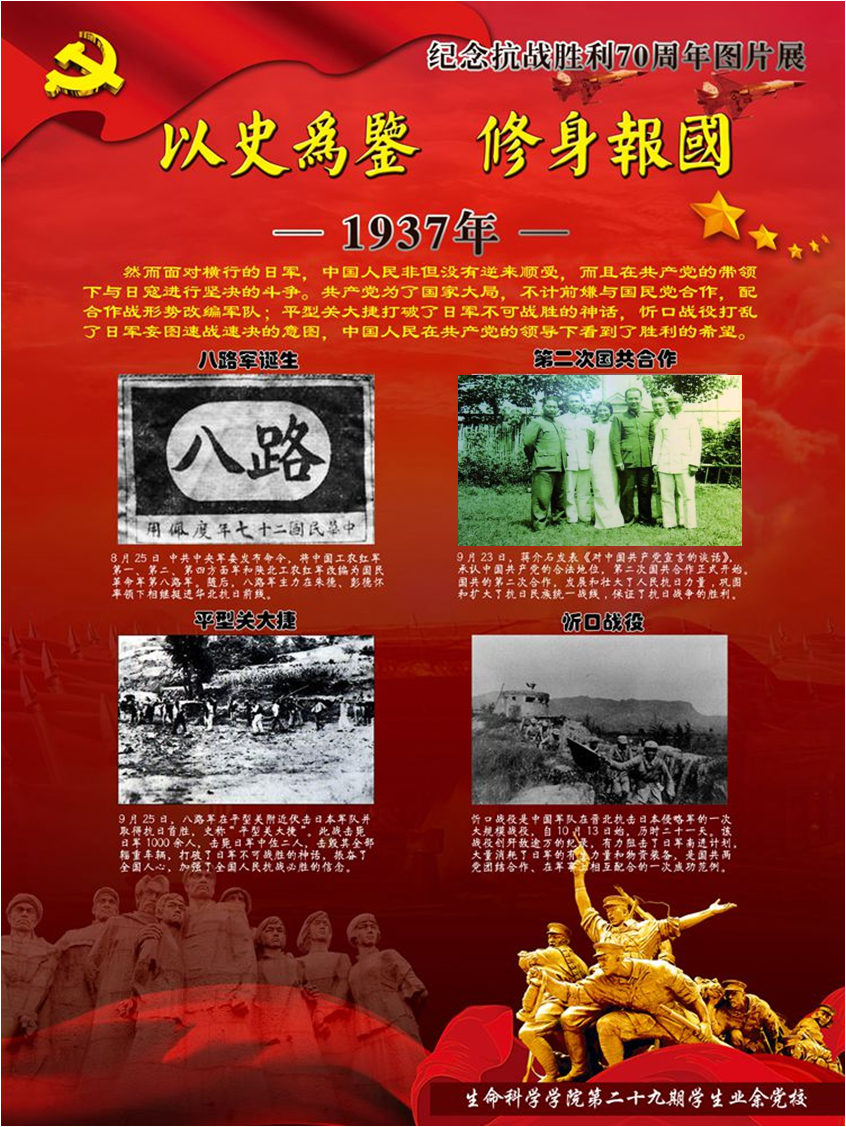今年是世界反法西斯战争暨中国抗日战争胜利70周年。70年前中国人民经过八年艰苦卓绝的抗日战争,无数英勇军民身先士卒浴血奋战,最终取得了抗战的伟大胜利,为世界反法西斯战争的胜利做出了巨大贡献。70年后的今天虽然没有了硝烟四起的战争,但新时期青年不应该忘却那段历史,更不应该忘记那段历史中共产党人的巨大牺牲。因此taptap体育员工业余党校制作了纪念抗战胜利70周年图片展,带领大家穿越时光的隧道,抚今追昔,饮水思源,缅怀先烈,激励斗志!