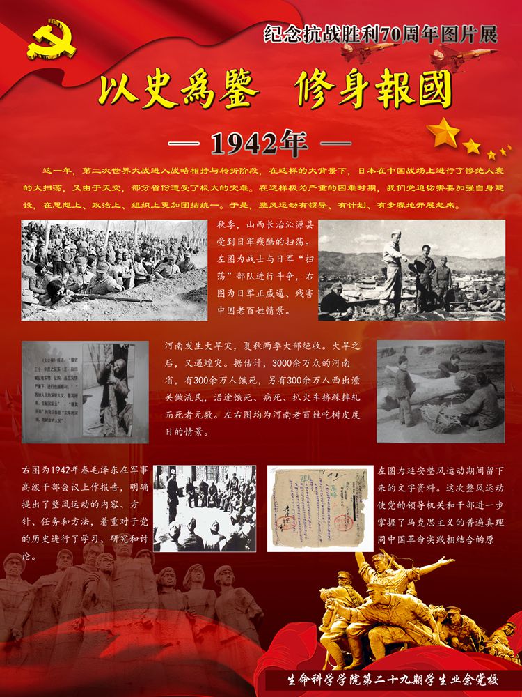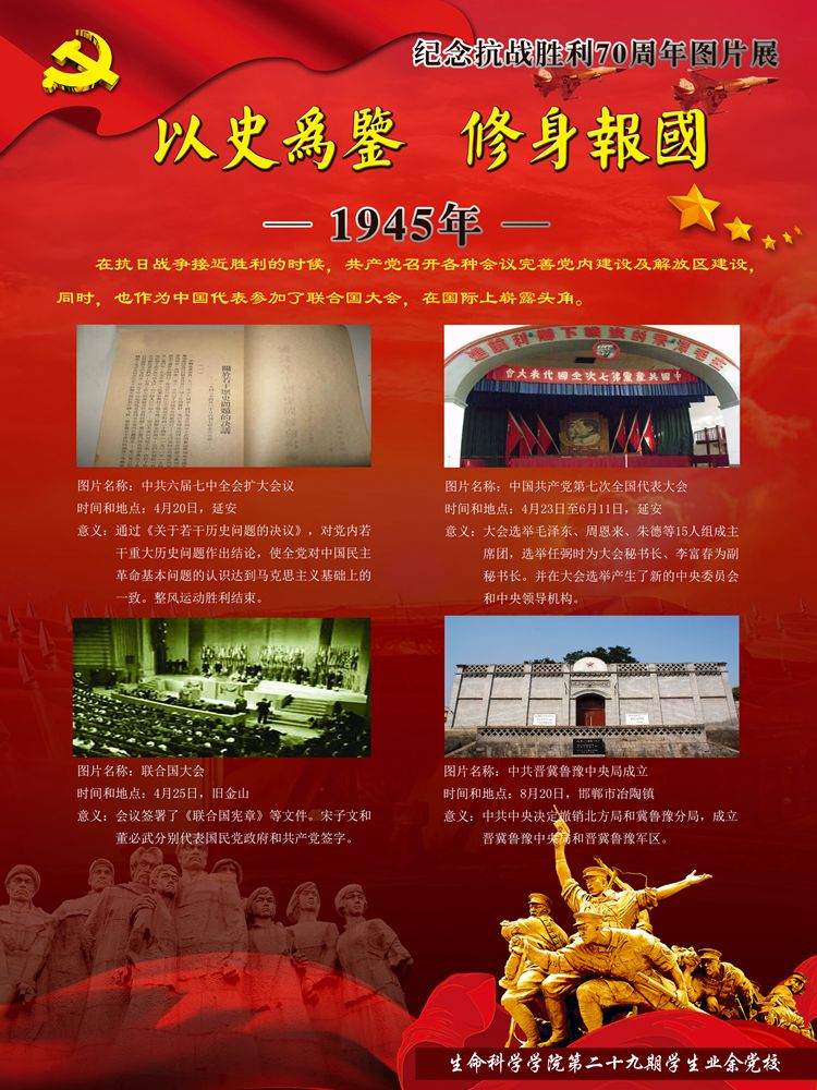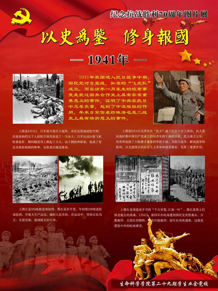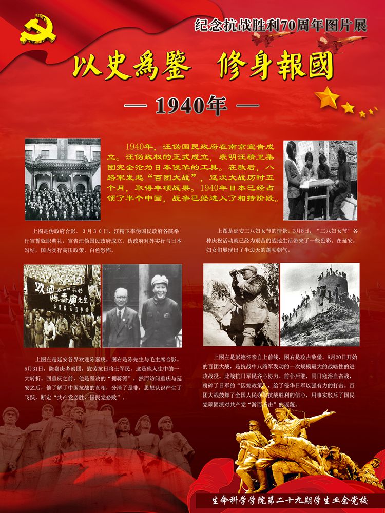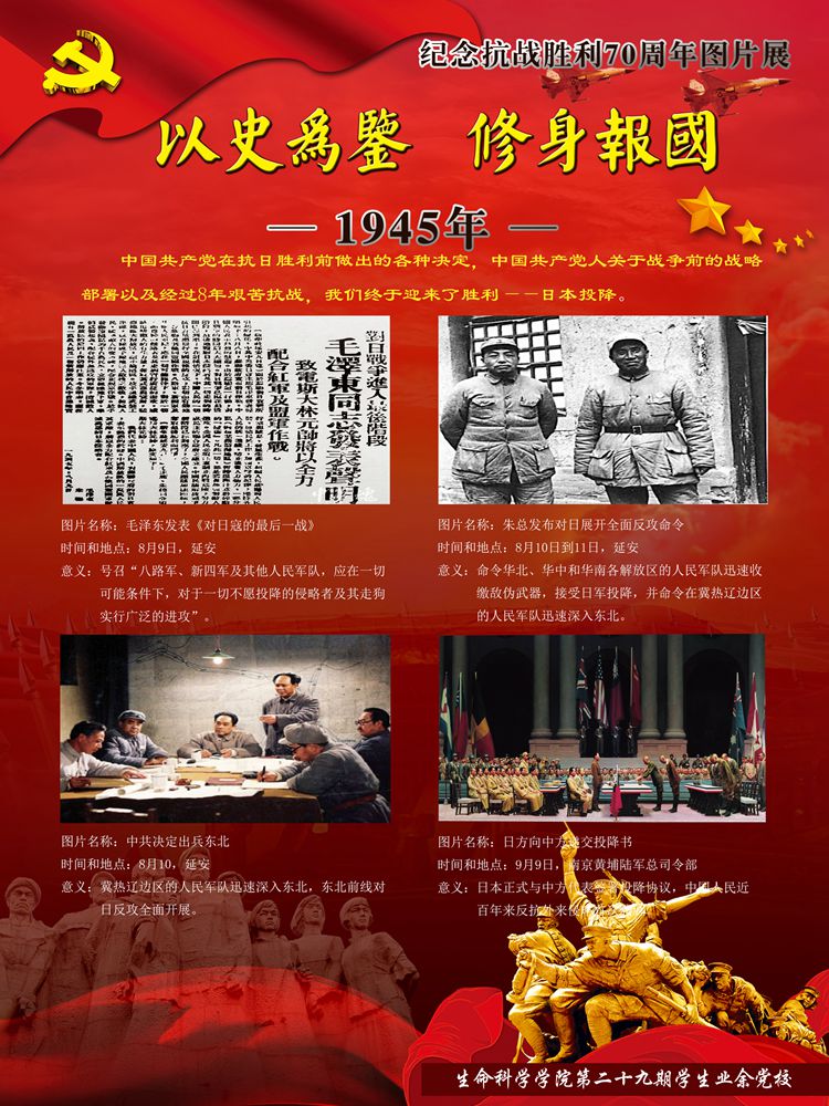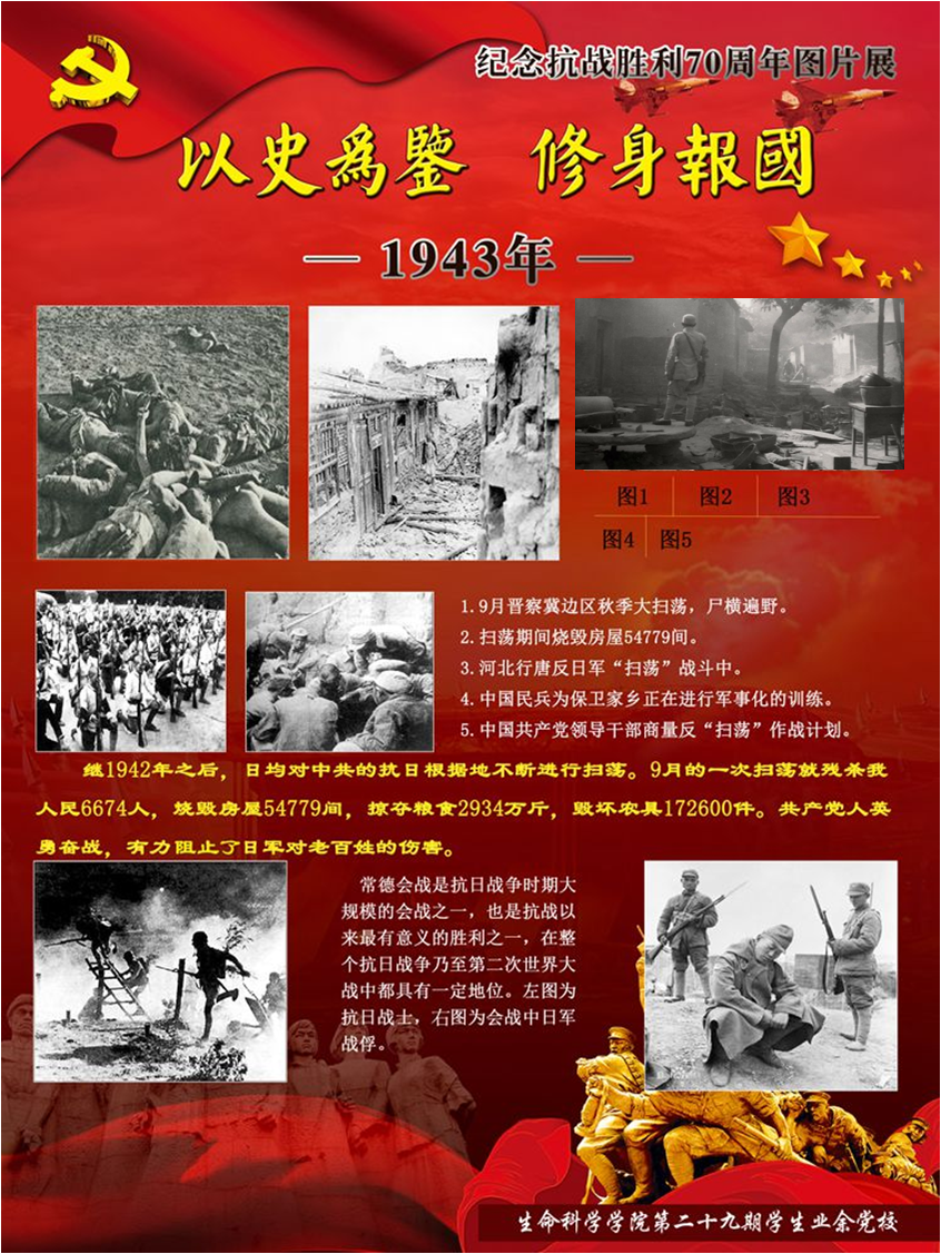 今年是世界反法西斯战争暨中国抗日战争胜利70周年。70年前中国人民经过八年艰苦卓绝的抗日战争,无数英勇军民身先士卒浴血奋战,最终取得了抗战的伟大胜利,为世界反法西斯战争的胜利做出了巨大贡献。70年后的今天虽然没有了硝烟四起的战争,但新时期青年不应该忘却那段历史,更不应该忘记那段历史中共产党人的巨大牺牲。因此taptap体育员工业余党校制作了纪念抗战胜利70周年图片展,带领大家穿越时光的隧道,抚今追昔,饮水思源,缅怀先烈,激励斗志!