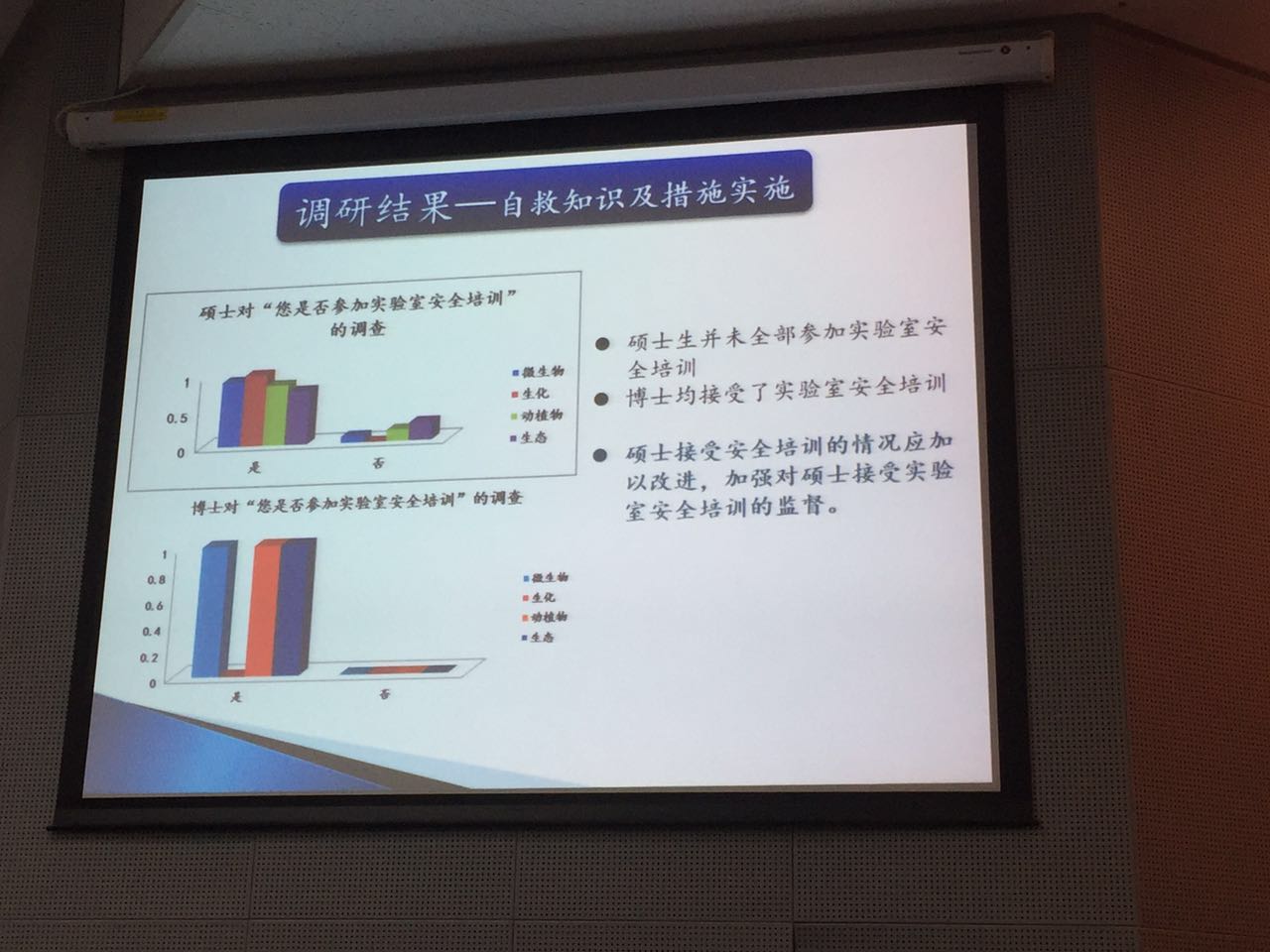 在调研的汇报会上,各个小组的负责人分别用PPT的形式汇报了调研成果,分析了调研中发现的问题,提出了切实可行的解决办法,过程中充分体现了党员同志们的认真思考。如“青年员工对网络舆论的态度”调研组,就针对青年员工对网络文章的关注倾向和网络舆论对员工自身的影响程度,提出了应从四个方面引导网络舆论的正确方向;“理工科员工对实验室安全的重视程度”课题组,结合调研中发现的问题,提出了应加强对硕士接受实验室安全培训的监督,加强对员工自救知识和自救措施的掌握,同时要重视废弃物的处理问题,避免废弃物的污染。