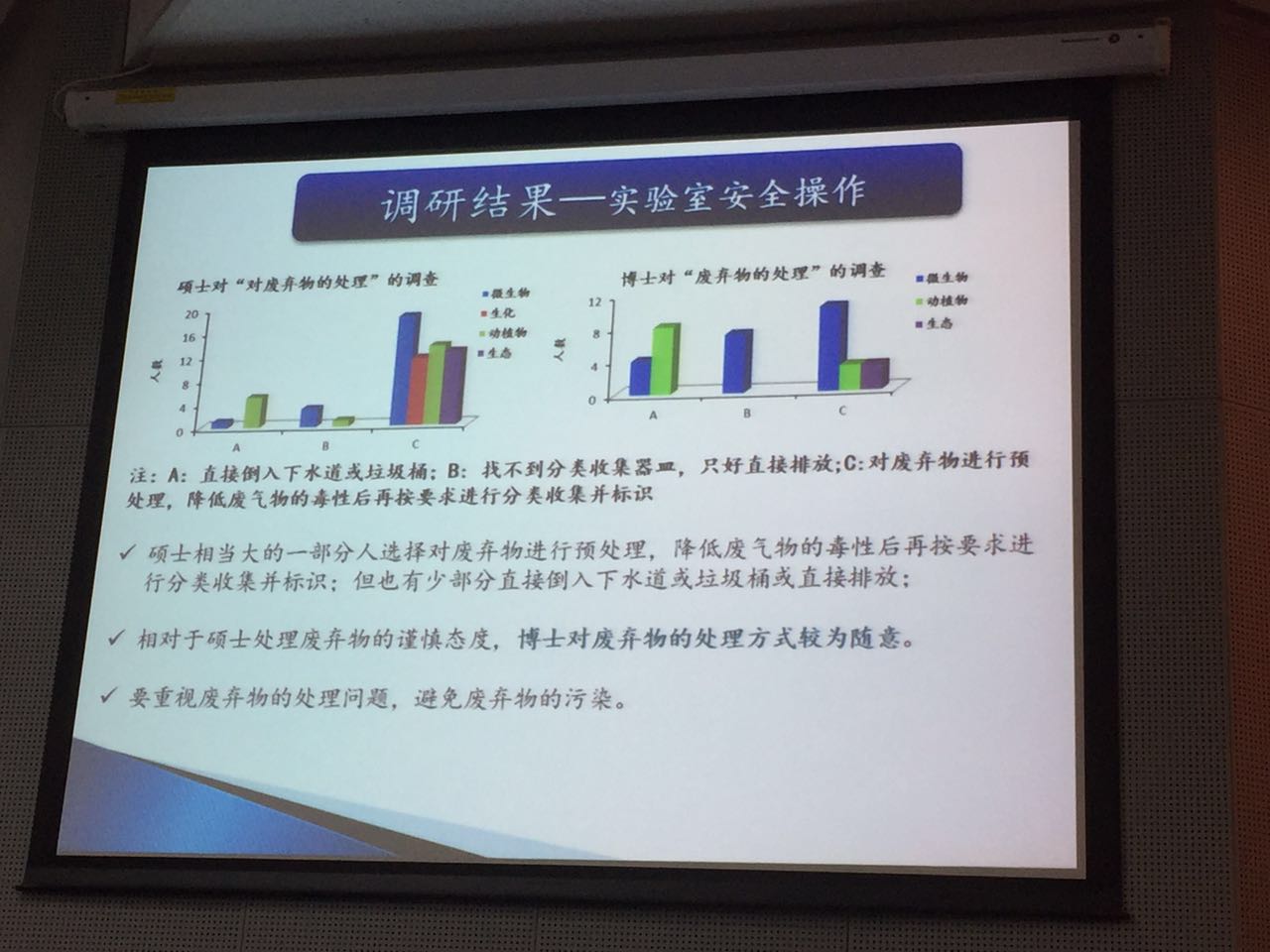 在调研的汇报会上,各个小组的负责人分别用PPT的形式汇报了调研成果,分析了调研中发现的问题,提出了切实可行的解决办法,过程中充分体现了党员同志们的认真思考。如“青年员工对网络舆论的态度”调研组,就针对青年员工对网络文章的关注倾向和网络舆论对员工自身的影响程度,提出了应从四个方面引导网络舆论的正确方向;“理工科员工对实验室安全的重视程度”课题组,结合调研中发现的问题,提出了应加强对硕士接受实验室安全培训的监督,加强对员工自救知识和自救措施的掌握,同时要重视废弃物的处理问题,避免废弃物的污染。