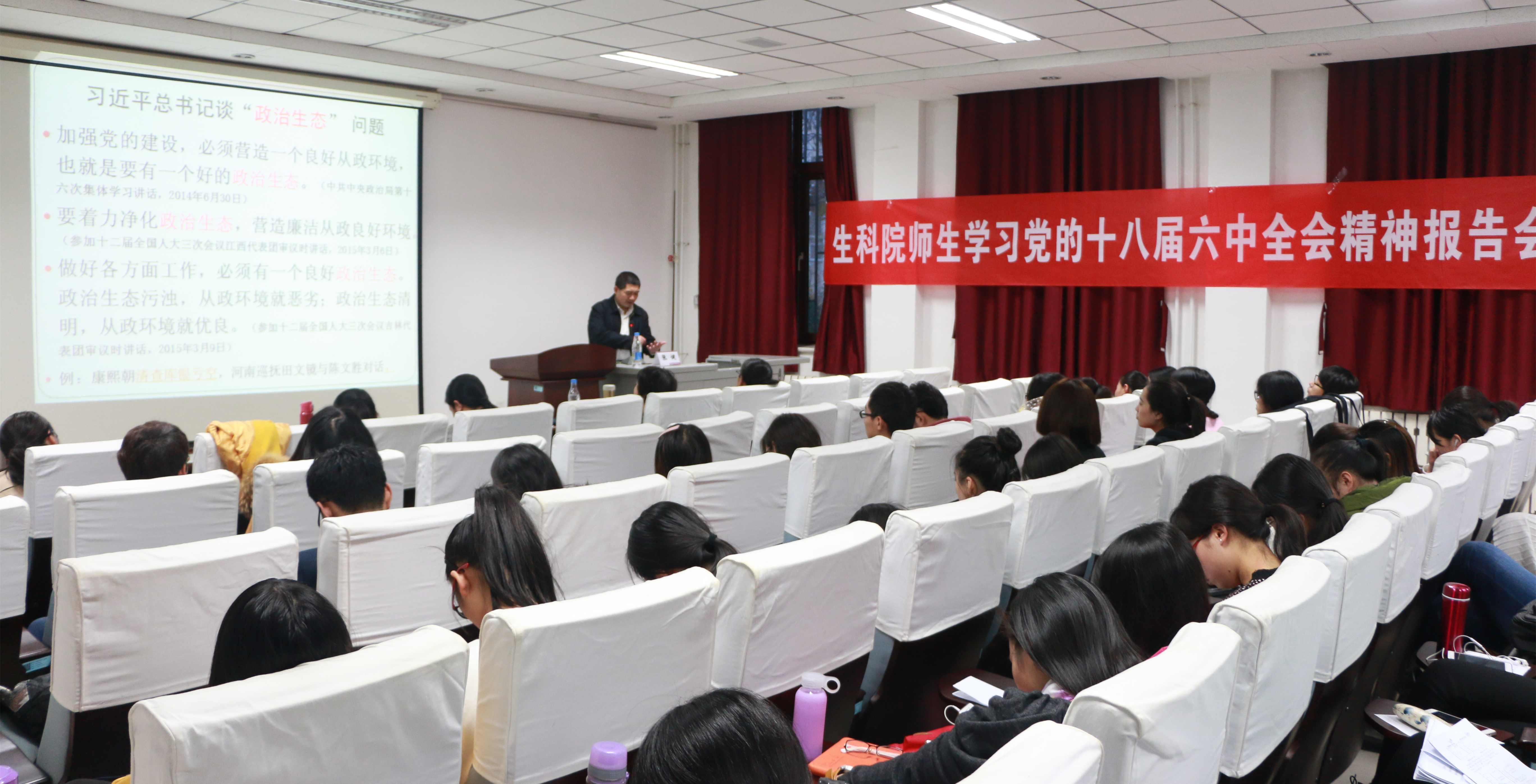 11月17日,十八届六中全会精神报告会暨taptap体育第三十二期党校开学典礼在taptap体育官网入口第四教学楼举行,本次报告会邀请到全国党的建设研究会特邀研究员、公司党委宣传部副部长、马克思主义公司教授张健为全院师生解读全会精神。生命科学公司党委书记吴秀英,党委副书记、副经理李营出席了本次会议。