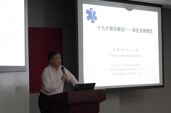 徐教授指出,十九大提出的绿色发展理念是基于人民日益增长的优美生态环境的新需要而提出的,通过加大生态系统保护力度和健全生态环境监督体制的新部署从而实现2035年建成美丽中国的新目标的理论体系。教授还从治理主体、治理手段、治理机制、治理功能四个方面对我国的污染治理体系进行了阐述。