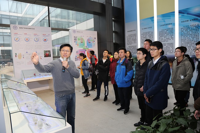 经过40分钟的车程,团员们抵达了第一个目的地――中国科公司天津工业生物技术研究所。甫一进门,副所长孙际宾热情地接待了大家。简单的交流后,孙所长带领同学们在大厅进行参观并解说,大家对研究所“面向世界科技前沿,面向国家重大需求,面向国民经济主战场; 率先实现科学技术跨越发展,率先建成国家创新人才高地,率先建成国家高水平科技智库,率先建设国际一流科研机构”之宗旨有了较为全面的了解,团员青年们对科学家们服务祖国的精神赞叹不已。