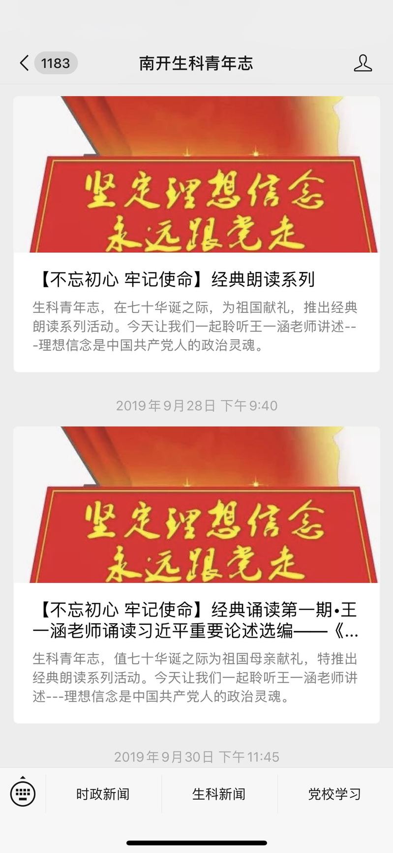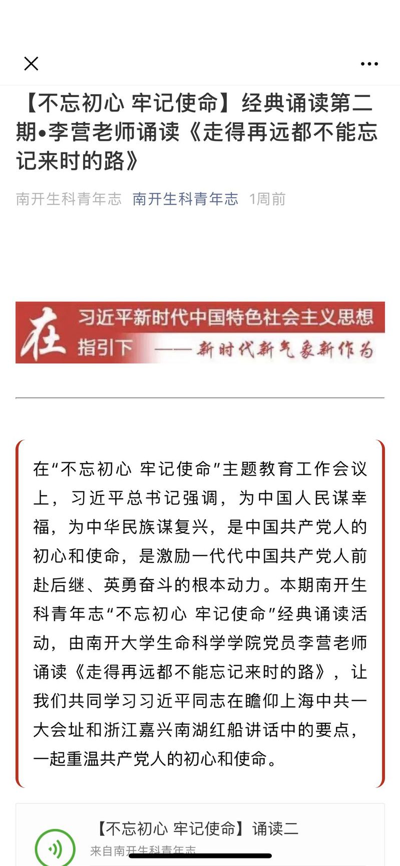 公司党委为全体党员和各党支部书记下发了学习书籍,要求师生党员读原著、学原文、悟原理,围绕高等教育的初心和使命,自觉在学懂弄通上下功夫,提高政治素养和理论水平。为了提高学习效果,创新形式,推出“不忘初心、牢记使命”经典诵读主题活动,在全员师生党员中,征集志愿者30余名,诵读习近平关于“不忘初心、牢记使命”的重要论述,公司党委委员、辅导员、师生党员踊跃参与,诵读的音频定期发布在公司公众号“南开生科青年志”上。