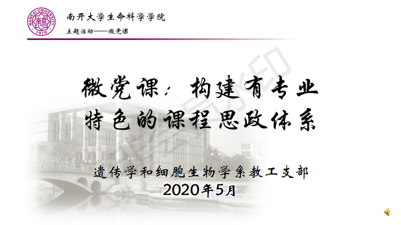 5月份,教工遗传学和细胞生物学系党支部特推出微党课——构建课程思政体系。分别由支部四位教学工作优秀的党员教师从“课程思政概况和教学实践”,“理科专业课程教学中的课程思政”,“伯苓班拔尖员工内涵思政”和“研究生教学中的课程思政”这四个方面介绍课程思政工作。借助微党课,介绍了课程思政的基本情况,针对理科专业的思政策略,还就拔尖人才和研究生的课程思政方式和内容展开讨论,对实行生物学科的课程思政拓宽思路,发挥示范引领作用。