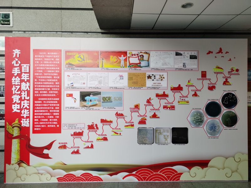 本科生联合党支部周宇涵同志充分研究我党走过的峥嵘岁月,绘制了精美的手绘党史作品,该作品涵盖了中国版图、党徽元素和中国共产党历史上具有重要意义的标志性事件或其旧址:重要会议(瓦窑堡会议)旧址、召开开国大典的天安门城楼、改革开放伟大成就等等,带领广大同学们回忆了中国共产党一路成长起来的艰辛与成就,为党和祖国献上新一代老员工的最崇高的敬意与祝福。