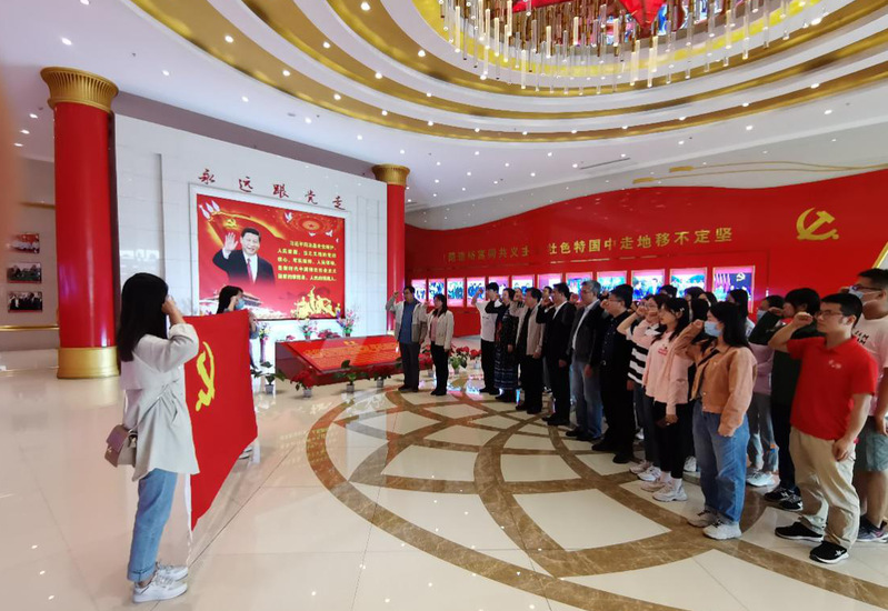 师生一行首先来到贾家庄基层干部培训基地进行参观学习。贾家庄是“2020年度中国全面小康乡村振兴十大示范村镇”,曾多次受到国务院嘉奖,荣获“全国先进基层党组织”和“全国文明村”等称号。在党的领导下,经过一辈辈村民的艰苦奋斗,治理盐碱地况,兴办村办工业企业,大力发展旅游业,形成了农、工、商、娱、旅齐头并进的新面貌。参观结束后,全体党员面向党旗,庄严宣读入党誓词。教工党支部书记潘皎表示:通过实地参观了解贾家庄的发展历程,感受贾家庄村党员干部敢于担当、勇于创新的优秀品质,真切感受到了老一辈党员干部踏实肯干、求真务实、自强不息的贾家庄精神。在今后的工作和学习中,党员要在教学、科研、育人多方面努力发挥模范带头作用。