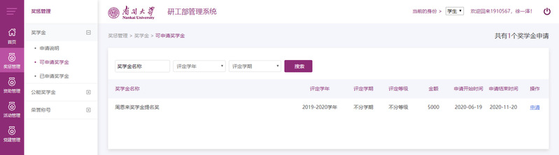 在奖学金模块中可以查看申请说明和当前可申请奖学金,本模块包含可申请有国家奖学金、周恩来奖学金、公能专项奖学金。