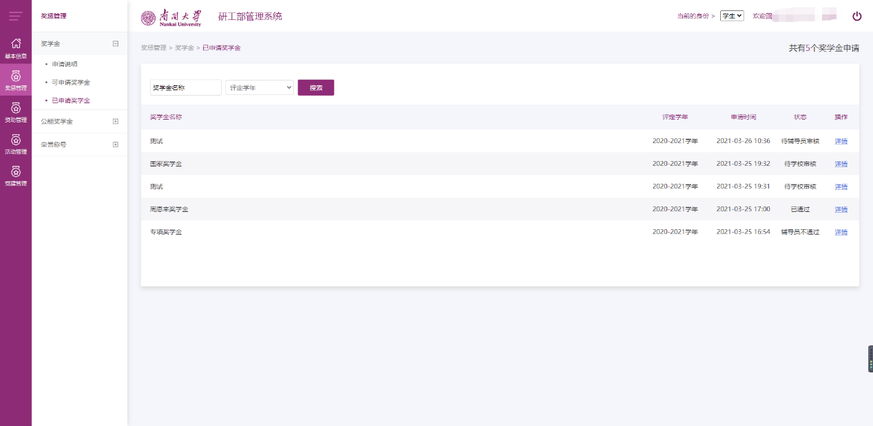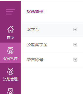 申请人登录研究生信息管理系统后,鼠标滑动到左侧“奖惩管理”栏目,显示“奖学金”“公能奖学金”“荣誉称号”。如下图: