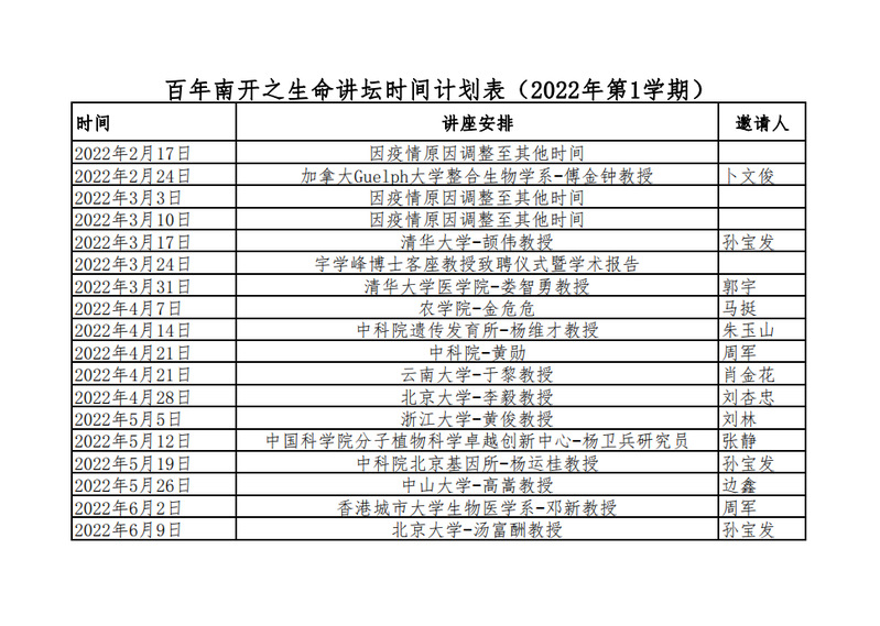 百年南开之生命讲坛时间计划表(2022年第1学期)