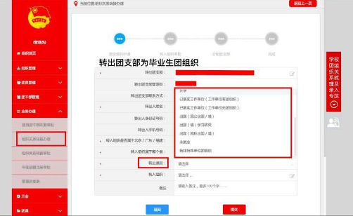 转出原因[(转往特殊单位团组织)]:因参军入伍等涉密情况需转往特殊单位团组织时,无需选择转入组织,业务提交后由省级团委管理员负责审批。