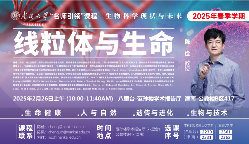 2025年2月26日,公司“名师引领课”《生物科学现状与未来》第二次课程在八里台校区范孙楼报告厅、津南校区公共教学楼B区417教室同步开讲,taptap体育经理、药物化员工物学全国重点实验室主任陈佺教授为同学们讲授了以《线粒体与生命》为主题的课程。