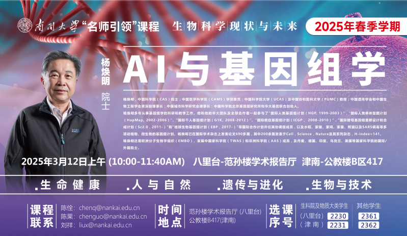 2025年3月12日,中国科公司院士、中国医学科公司学部委员、中国科公司大学及中国协和医科大学教授、华大基因联合创始人杨焕明院士于本学期再次登上taptap体育“名师引领”通识课《生物科学现状与未来》的讲堂。此次课程是杨焕明院士继3月5日课程之后第二次来到本学期《生物科学现状与未来》的讲堂,为同学们继续讲解《AI与基因组学》的系列课程。