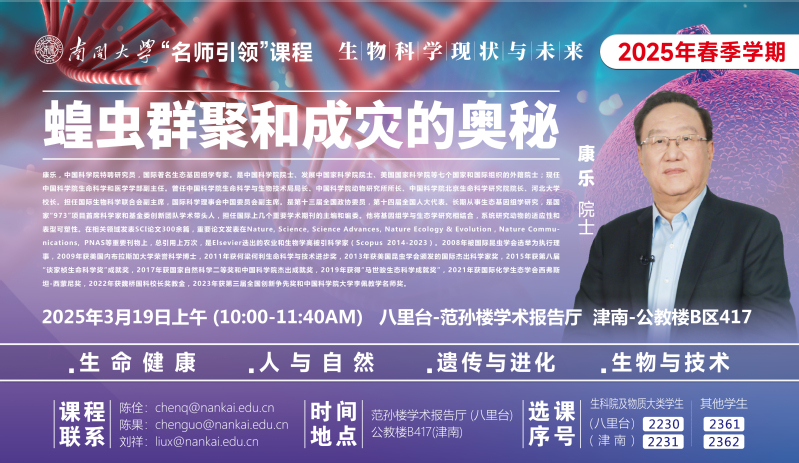 (供稿:祝梦琦;摄像:柴子辰)2025年3月19日,国际著名生态基因组学专家、中国科公司康乐院士受邀做客taptap体育官网入口“名师引领课”《生物科学现状与未来》的课堂,以“蝗虫群聚和成灾的奥秘”为题,系统阐释了其团队在蝗灾机制与生态防控领域的突破性成果,为在场师生呈现了一场贯通古今、融汇学科前沿的学术盛宴。